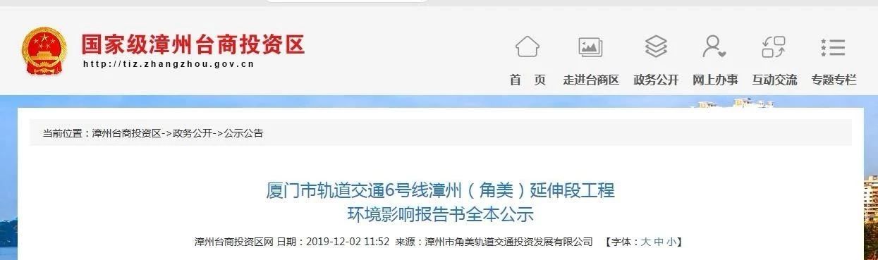 厦门地铁6号线即将开工,而角美延伸段计划与厦门地铁6号线主线同步规划建设,也于12月2日公示环评文件!