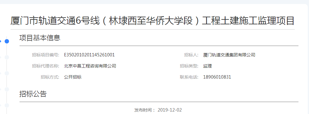 紧接着厦门市公共资源交易网公布关于厦门市轨道交通6号线(林埭西至华侨大学段)工程土建施工招标公告。