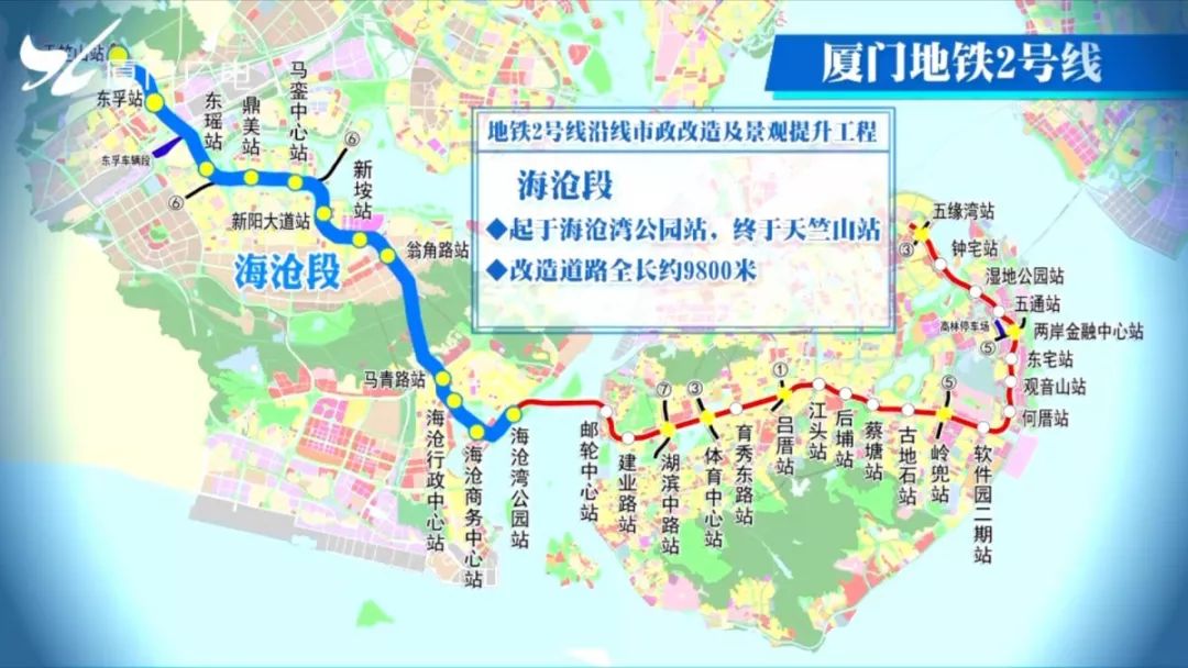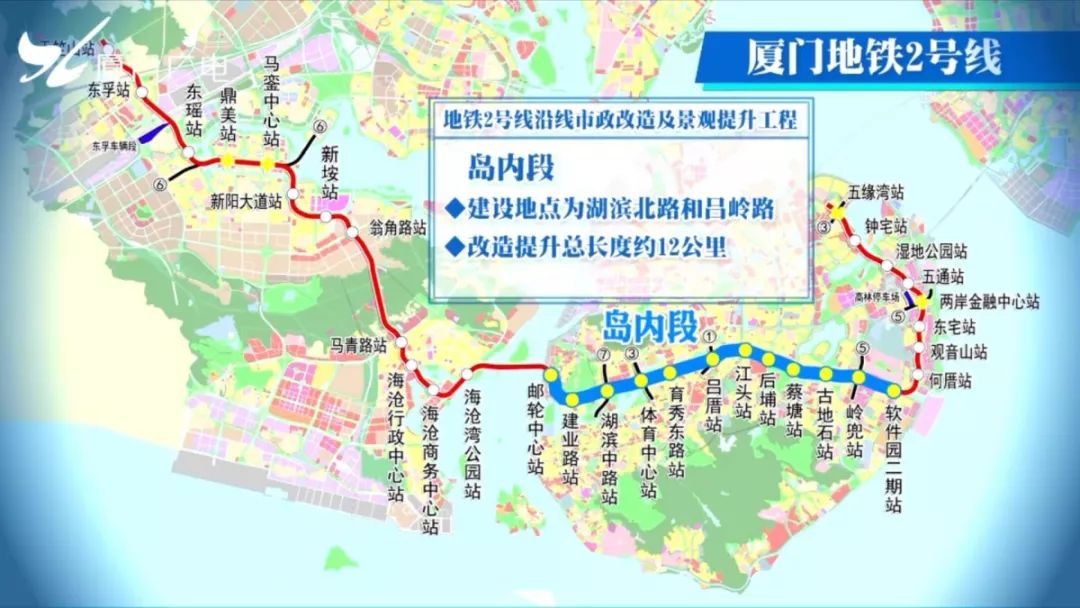 据介绍,地铁2号线沿线市政改造及景观提升工程分为岛内段和海沧段,岛内段建设地点为湖滨北路和吕岭路,改造提升总长度约12公里。
