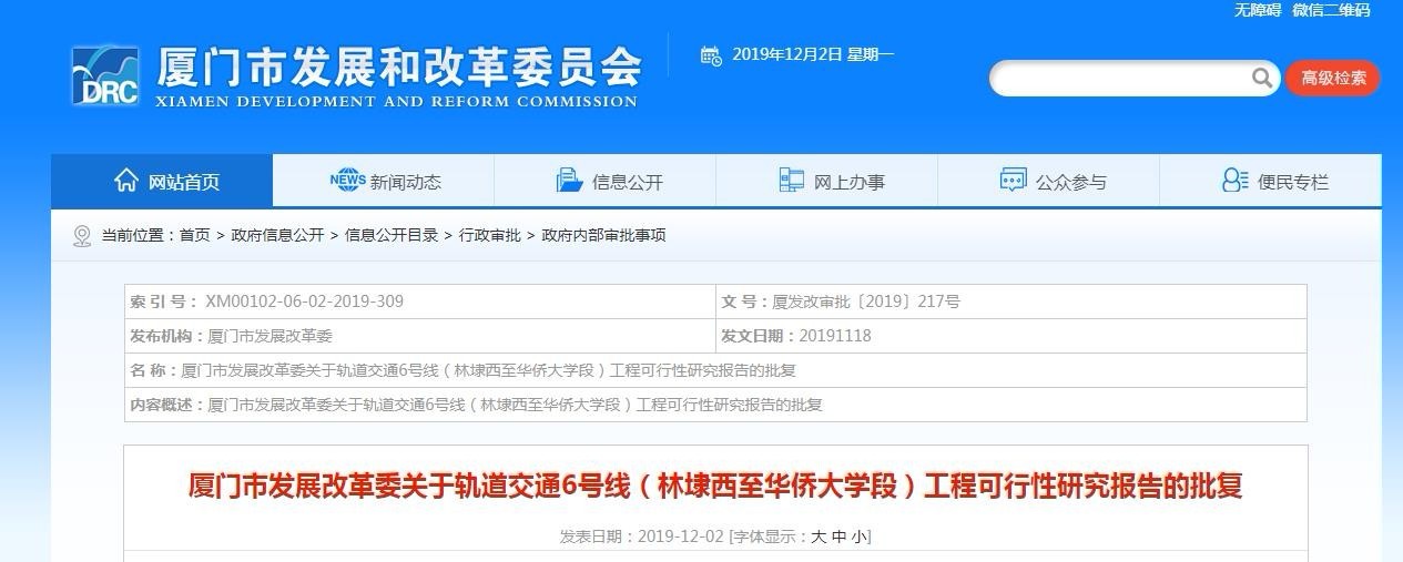 12月2日,厦门市发展改革委发布关于轨道交通6号线(林埭西至华侨大学段)工程可行性研究报告的批复。