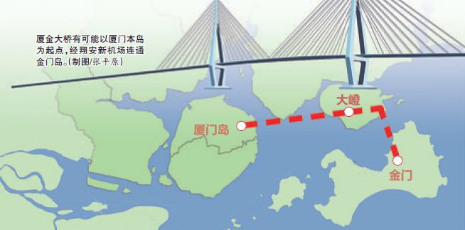 从2004年起,厦门至金门的厦金大桥建设的前期研究论证就已启动,今年10月,两地通桥已形成初步方案。大桥计划以厦门本岛为起点,经过厦门翔安的新机场,再联通金门岛。同时根据大桥不同区段的车流量需要,还将分别设计4至8车道的桥梁。