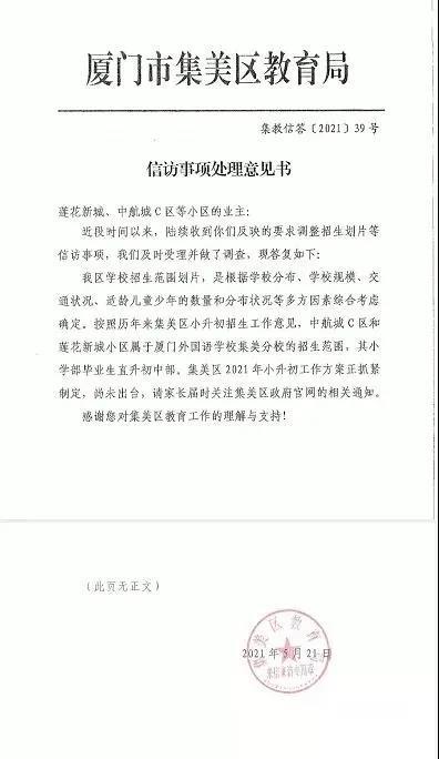 此前,有网友爆料一份文件显示,集美教育局对莲花新城、中航城C区等小区业主要求调整招生划片的信访事项做出了答复。