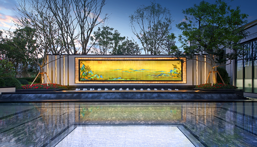 大门进入别有洞天,复刻留园冠云峰,迎客松和山水石层层交叠,微缩精致江南山水。约10米长《千里江山图》玻璃绢画,画内烟波浩渺,层峦起伏,承袭千年江南风雅,擘划府第图景。匠心打造九级台阶,包含着步步高升的美好寓意。