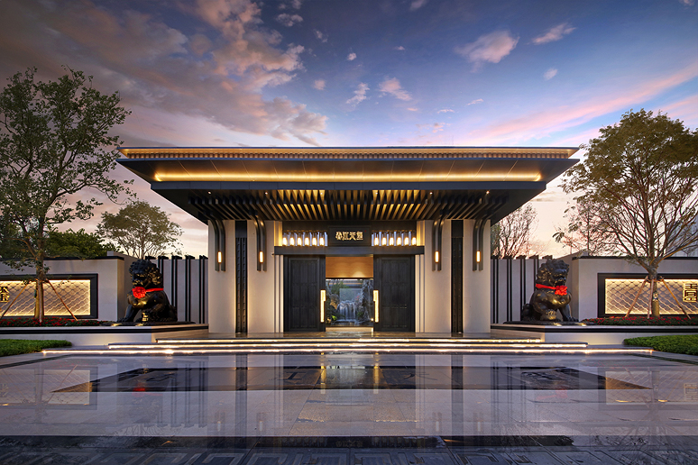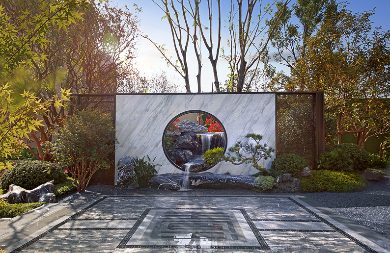 仿写网师园,芳草夹道,绿植掩映,四季风景在此处流连。采用框景式造园手法,凝练东方美学意境,以一扇诗意月洞门,将人文与园林之景交织。门口两座高约1.5米抱鼓石,石雕吉象,鼓雕玉兰、海棠牡丹,彰显门第礼仪。