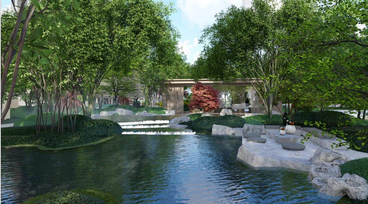 以留园清风池馆为蓝本,将山石花木与清风池自然配置,打造出可赏、可游、可乐的中心水景空间。 约300㎡超级中心水系景观,高昂造价,只为给业主更好的生活品质。中心区各空间围水而设,视线相互倚借,布局精巧。