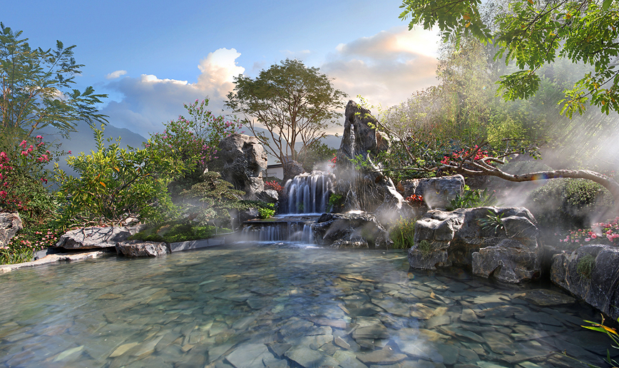 以精巧的叠石,运用高度的技巧拼镶成山峰。“高山”之间曲水潺潺流出,别有洞天。其间点缀树木,构成了山、水、植物的和谐之美。