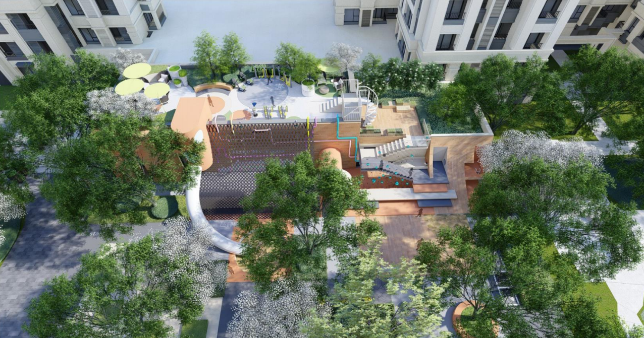 植栽桃树,花开艳若朝霞,花谢落英缤纷。摆设丰富种类健身器材,满足全龄需求,休闲赏景、运动健身。