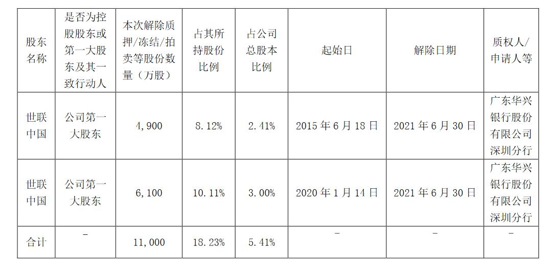 7月13日,深圳世联行集团股份有限公司(简称“世联行”)发布关于股东股份解除质押的公告。