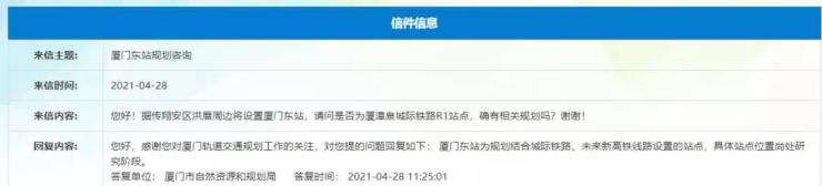 近日,有网友提问关于翔安区洪厝周边将设置厦门东站,请问是否为厦漳泉城际铁路R1站点,确有相关规划吗?对此,厦门市自然资源和规划局表示:厦门东站为规划结合城际铁路、未来新高铁线路设置的站点,具体站点位置尚处研究阶段。