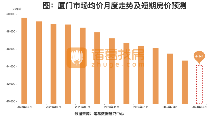 从房价水平来看,4月厦门市场均价为44688元/㎡,环比下降1.75%,同比下降10.15%